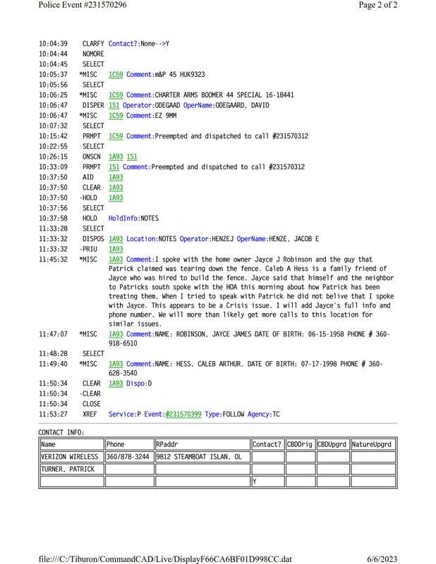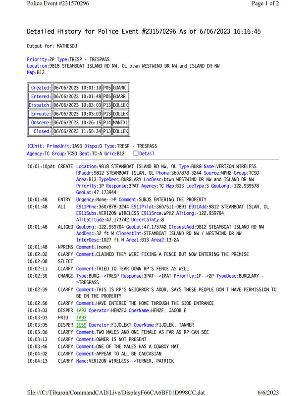 Records Requested: Theft in progress OWNER NOT HOME at 9818 Steamboat Island RD NW, Olympia, WA 98502 about 10:00 AM on 6/6/2023. Fencing company entered disabled Jayce Robinson home without permission. THREATS FROM YESTERDAY. Conflict of interest wanting my business and tear down my fence. One vehicle already left with a man. A lady screamed and a kid was around the side property as another man entered front. New fencing being put up and connected to mine. Trespass. Cowboy with tattoos looking people could be armed and dangerous. Got restricted call from Deputy Hansen 11:38 AM said he went there and all those people live there. Didn't want to hear it. I called TCSO Non Emergency 360-704-2740 at 11:51 AM to get a proper followup as they told me Deputy only called 'THE OWNER' not reporting crime but they can't tell me anything else. I got a call back from Deputy Hansen Restricted at 11:55 AM with same response as he allowed the unknown fencers to finish today's job plus trespass and claim everything is ok, he knows the owner Jayce Robinson as he called him but didn't know he is disabled or the parents who rented to him prior. Neither was Mr. Taylor questioned, females or vehicle owners that left the scene was talked to. Ref: Jayce Robinson 9818 Steamboat Island RD NW, Olympia, WA 98502 - Carlyon Beach Homeowners Association Type 3 Building Permit - I refused their fence on my land and told them to check property lines plus get owner permission!