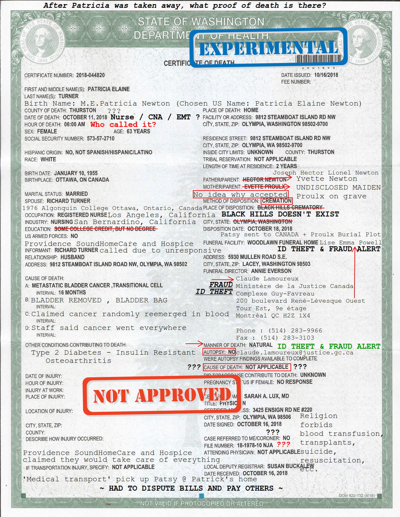 My mother, Marie Elaine Patricia Newton (born in 1955 Ottawa, Ontario, Canada) was taken away after we had to dispute with the State of Washington in the USA about her residency status back in 1979/1980s (claiming her Permanent Resident Alien status expired and all prior renewals of ID didn't matter) - my family was forced to move from California - we even had to rebuttal with social security / medicare to get basic coverage. Someone lied to my mother about her being French Canadian and started to make a fake family for us before this occurred with fake names including adding JEWS to the family. Before my mother's disappearance estimated 10/11/2018 (my Dad/Sister says it's 10/13/18) - as attached is an unedited photo of her, Patricia E. Turner (Declared as Patricia E. Newton when came to the USA) - the photo is dated 09/27/2018 on my prior phone a Motorola G4 on Republic Wireless 360-209-3697 (that is in evidence lockup) before bed that night. It is exactly how she should have looked before she was taken away. " I was cured all right " - Treatment Completed as proven in discharge papers that they wanted me also If you want to call me, 360-878-3244 (they have the family's contact as mine and harass them daily) PLEASE SEE EVIDENCE FILE It has happened here too -- The Persecution of whites / Rhodesian and associates of South Africa Strikeforce 20 PD Gangintel - Gang Task Force & SLATT - 20 PD Gangintel Niilo Ylinen Jon Pressley died the other year, texmex is doing what late mr.metzger told us to do all these years, get in high positions ---- Another person of interest is Rosa Saikali (Native American) who travels from Miliani, HI to Canada has a records / run in with the law. She started to make up things and lie to the family also. ---- RE: FRAUD - Random dead person named Claude speaking through email claims this to be my family [ Dad/Sister was commanded to delete emails / everything after they took mom away 2018 ] -- [email protected] | [email protected] RE: Kidnapping / Disappearance / Murder of my mother - Patricia Elaine Turner (Immigration: Patricia E. Newton) Birth Name: M,E,Patricia Newton SAME HAPPENED WITH GRANDPARENTS HECTOR AND YVETTE NEWTON - Ottawa, Ontario, Canada - providing different maiden names PLEASE REVIEW THE ATTACHED EVIDENCE AND ADD TO FILE NOW THERE IS DNA MISMATCH ONLINE - Suspected to be Darlene Tardioli (Newton) - " Aunt Dee " , Madeleine or Diane As requested, the correspondence plus book attachment which has some very interesting data and intelligence gathering. Here is another person that my family hasn't known before who has similar names in their family with similar titles / scenarios or other lies fed to them over the years. Other lies include dates and times of events - also evident on official government records! More fraud / ID theft from the Claude Lamoureux side (falsified family) >> with Lise Powell (who now claims the Lamoureux name) - similar sob story. Asking for handouts. Fake your own death, take witness protection / think up something and go with it or make some money. Claimed Mother: Rollande Proulx Claimed Father: Albani Lamoureux Claimed Sibling: Marie Elaine Patricia Newton [ Married name: Patricia Elaine Turner ] - My mother -- you can search various individuals' family trees online for that Lamoureux (especially Claude or Albani) name - it does follow various Lamoureux around [with politicians / lawyers / bankers / Jews / etc. ] - but their siblings / marriages are usually FAKE!!! [ maybe everything is ] Dan Bowie who rages out and refuses to be a gentleman, a so-called friend that mom grew up with, is a suspect. Claim cancer to obtain pot, retired long distance trucker who visits California and Washington State from Canada. Want to read Lamoureux's sad pitiful lame excuse for a life and times story of a falsified family? This book - THE LIFE AND TIMES OF JEAN HOMÈRE PROULX (RESTRICTIONS) was sent to me / my family by our suspect pretending to be Claude Lamoureux P.S - Alert your webmaster and Network Administrator of these hackers / fraudsters / " Denial-of-service attacks " ~ BLACKLIST ENFORCEMENT ~ NEWEST HACKERS , SCAMMERS AND HARASSMENT FROM RANGE OF IPs from the similar area as of Fall 2021 BLOCK THESE IPs FROM ACCESS / BLACKLIST Also using IPv6 CIDR Format 2601:0603:4e80:23c0:50f4::/32 or Currently-Blocked IP Addresses: Server Setting Beginning IP Ending IP 24.17.235.185 2601:0603:4e80:23c0:50f4:0000:0000:0000/78 2601:0603:4e80:23c0:50f4:0000:0000:0000 2601:0603:4e80:23c0:50f7:ffff:ffff:ffff 2601:0603:4e80:23c0:50f8:0000:0000:0000/77 2601:0603:4e80:23c0:50f8:0000:0000:0000 2601:0603:4e80:23c0:50ff:ffff:ffff:ffff 2601:0603:4e80:23c0:5100:0000:0000:0000/72 2601:0603:4e80:23c0:5100:0000:0000:0000 2601:0603:4e80:23c0:51ff:ffff:ffff:ffff 2601:0603:4e80:23c0:5200:0000:0000:0000/71 2601:0603:4e80:23c0:5200:0000:0000:0000 2601:0603:4e80:23c0:53ff:ffff:ffff:ffff 2601:0603:4e80:23c0:5400:0000:0000:0000/70 2601:0603:4e80:23c0:5400:0000:0000:0000 2601:0603:4e80:23c0:57ff:ffff:ffff:ffff 2601:0603:4e80:23c0:5800:0000:0000:0000/69 2601:0603:4e80:23c0:5800:0000:0000:0000 2601:0603:4e80:23c0:5fff:ffff:ffff:ffff 2601:0603:4e80:23c0:6000:0000:0000:0000/67 2601:0603:4e80:23c0:6000:0000:0000:0000 2601:0603:4e80:23c0:7fff:ffff:ffff:ffff ***June Tally: 31 Farm Attacks and 3 Murdered White Farmers in South Africa*** Is anyone speaking up about the Murder of White Farmers? Transvaal farmers‘ union TLU SA has documented 5437 Farm attacks and 2067 farm murders in South Africa from 1990 up to May 2020. These figures only represent incidents reported to TLU SA and not all farmers. It also excludes farm workers that have been killed. https://www.thegatewaypundit.com/2020/06/june-tally-31-farm-attacks-3-murdered-white-farmers-south-africa/ P.S. - RIGHT THE WRONGS! Stop harassing my friends / family / neighbors and get your Richard Pryor in order! WHITE LIVES MATTER , 14 ~ DJ KYKE MASTER ~ 88 WotansVolk Vinland Mr. Patrick A. Turner 9812 Steamboat Island RD N